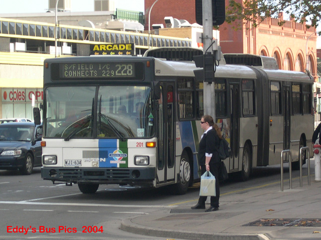 228 | One of the buses in the OBahn stripes (but with no guide wheels) making a left turn into Victoria Sq. | Eddy Howell |