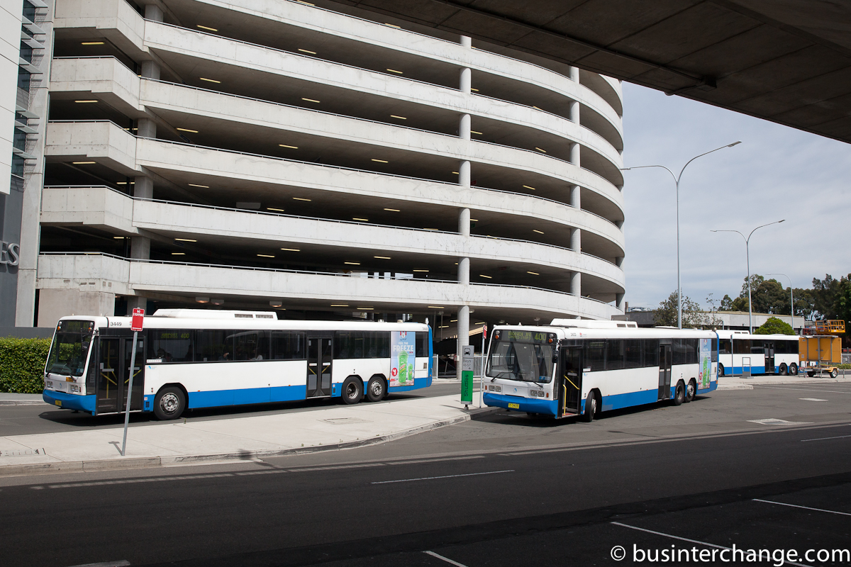 400 | Three long buses meet at the International Airport. Port Botany 3433 is laying up in the coach terminal, ready for a trip to Bondi Jn. 3449, also from Port Botany, arrives at the Airport and is about to terminate. Transit Systems (ex-State Transit) Kingsgrove depot 3426 follows on route 420, to Burwood. | Norbert Genci |